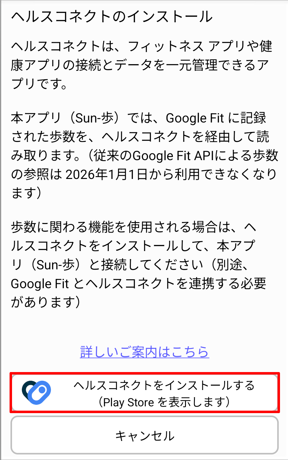 Sun-歩アプリを起動時、ヘルスコネクトがインストールされていない場合は、次のダイアログが表示されます。